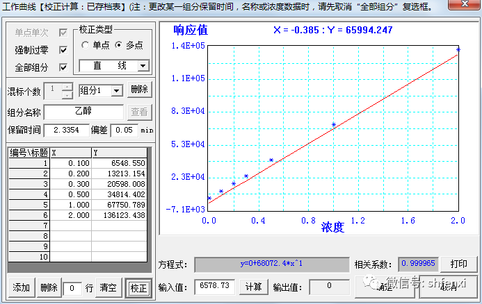 乙醇工作曲线为:y=0+68072.4*X 相关系数:0.99997
